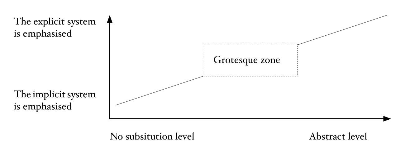 Not surprisingly, these two systems are active also while during role-playing, and they tie closely to the proposed model: there is a correlation between the two systems. When there is no substitution, the more the implicit system can be used. The further we go toward the abstract end of the model, the more the explicit system comes in to play (Picture 1). This argument is elaborated below by each category.