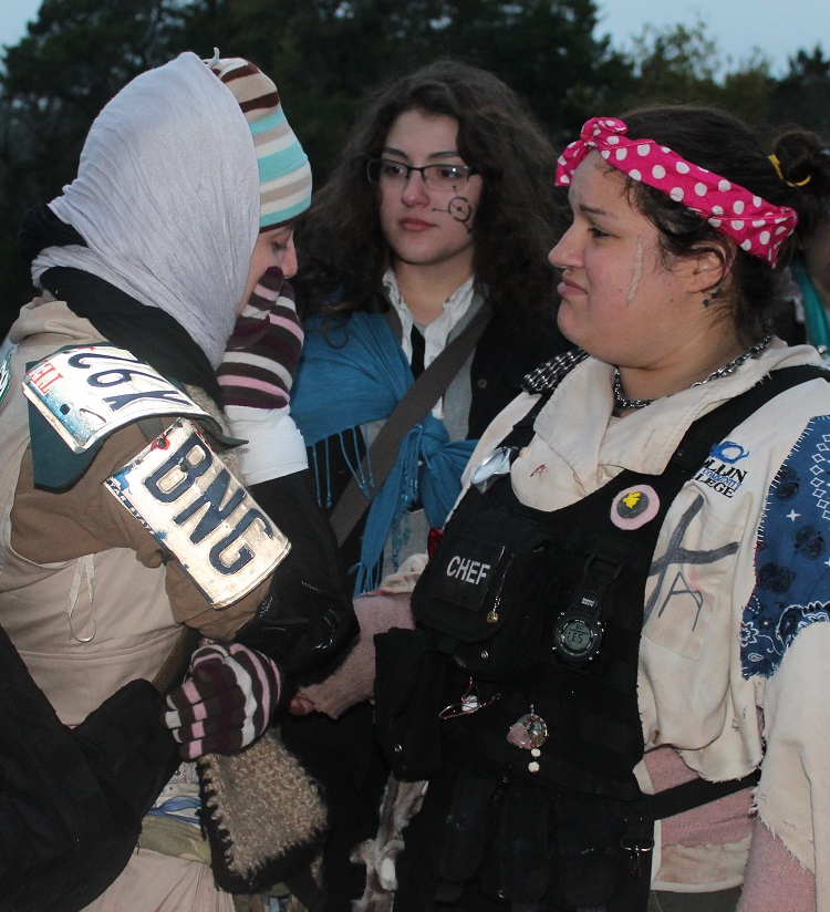 In DR Lone Star, an NPC player signals being off-game with a hand over her head and a whooshing sound, to be interpreted by characters as “the wind.” (Play, Sarah Lynne Bowman)An important post-game strategy is creating rituals of de-roleing. De-roleing is a method by which the player ritually casts aside the role and re-enters their former identity. Some strategies for de-roleing include: players removing an article of their characters’ clothing and placing it before them in the circle; participants stating what they want to take with them from the character and what they want to leave behind; organizers leading players through a guided meditation to ease their transition; etc. These symbolic actions allow players to switch from the frame of the character to the player in a manner that is less jarring than a hard stop.