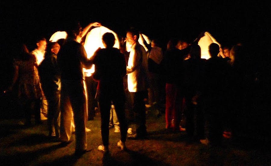 Lighting the paper balloons to commemorate the fallen. Photo by Elina Andersson. CC-BY-NC.- Fireworks and paper balloon ceremony: Each night after the green drink, fireworks were lit. In Act II and Act III, paper balloons were lit in memory of those who passed that year. The balloons rose into the air, then the lights winked out just over the horizon.