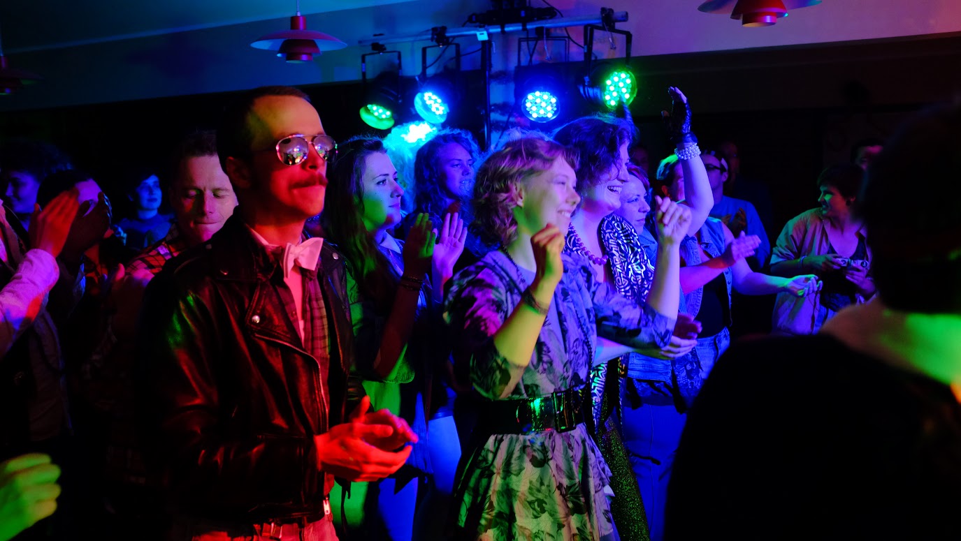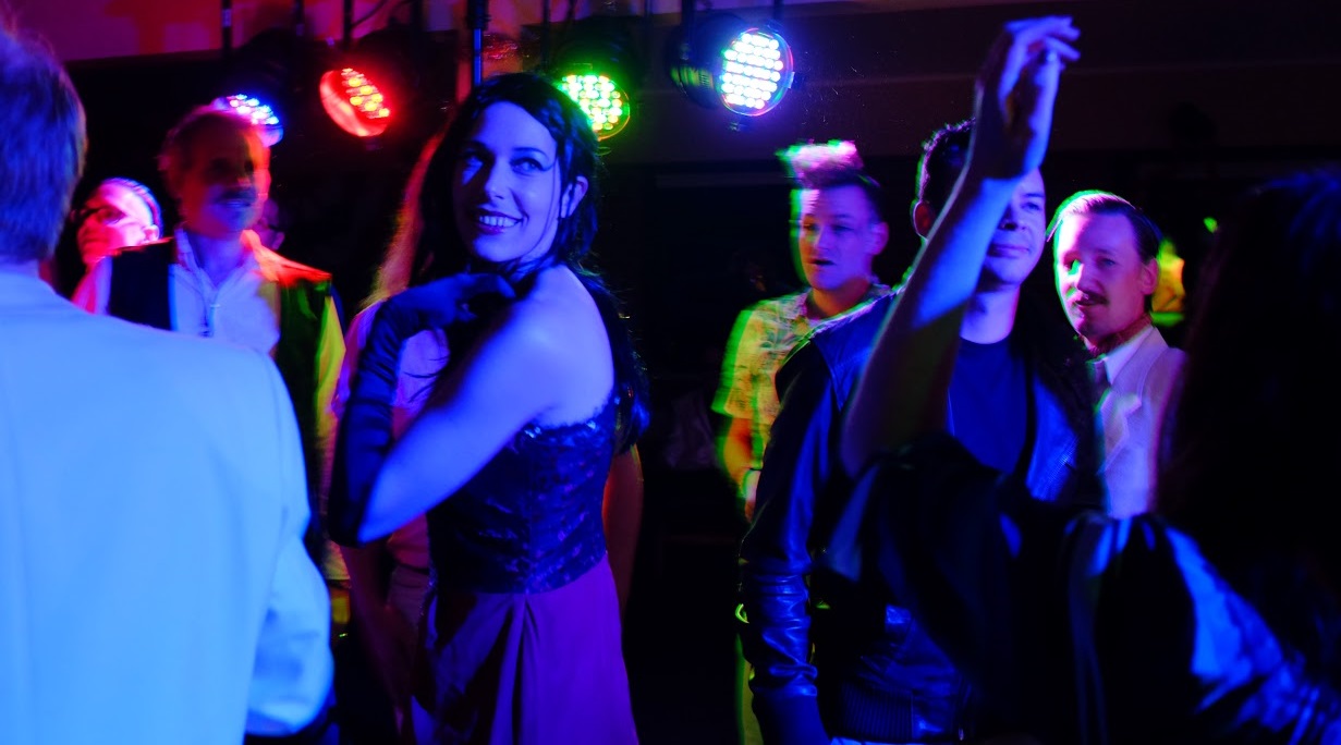 Most characters came together each year in a ritualized fashion for the drag/variety show. Here, they enjoy a performance by the rock band Urban Renaissance. Photo: Petter Karlsson. CC-BY-NC.In play reports, participants mention several powerful elements of the design. The characters have realistic motivations and relationship dynamics. The intersecting themes of desire, love, friendship, and fear of death interweave beautifully throughout the larp to provide a roller coaster of emotions for the players. The mechanics for sex and death are thoughtfully implemented, providing a meaningful, relatively safe framework in which to experience these powerful moments. The larp is organized into three Acts, with careful workshopping and debriefing exercises framing each phase. These breaks allow players opportunities to co-create the experience with one another through negotiation and agreement. While the larp does deal with the tragedy of disease impacting a tightly knit community of creative, experimental, open-minded people, the emphasis of the larp is not to dwell in tragedy, but rather to undergo a strengthening of that community through shared experience.