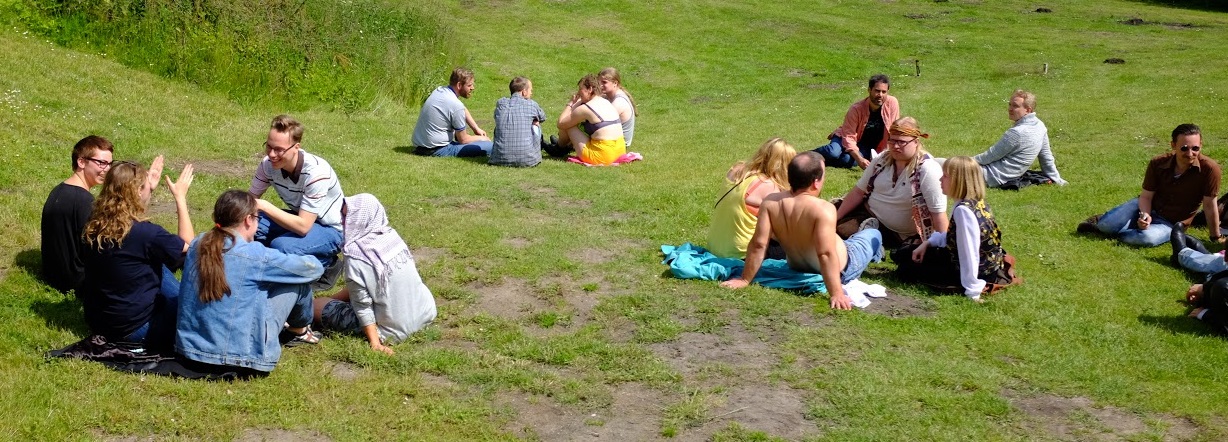 Off-game negotiation within core groups in between Acts helps direct play for the next phase. Photo: Petter Karlsson. CC-BY-NC.Game time itself is heavily structured with back-to-back in-game rituals, which I detail below. Players are empowered to design and run many of these rituals themselves, with the exception of the National Anthem, the Lottery of Death, and the funerals, which are run by the organizers. The 2015 run of the game had roughly the following structure, with some variation from Act to Act of non-essential rituals like tantra, BDSM, and drum circles: