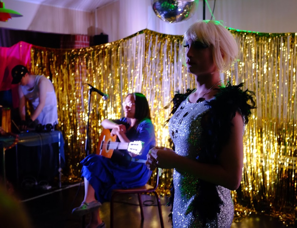 DJ Tony, singer-songwriter Marylou, and Nate, the Queen of Manhattan during the drag/variety show. Photo: Petter Karlsson. CC-BY-NC.- Drag /variety show: Performance art, drag shows, singing, male stripping, poetry readings, anti-war protests, safe sex public service announcements, and rock band performances. Most of the characters attended or participated in this ritual during each Act.