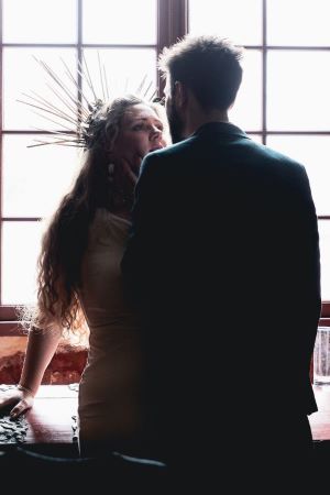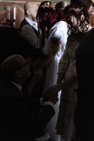 Pre-game workshops are often quite awkward experiences, especially whenpreparing to play larps of this nature. Players often feel a certain degree of social anxiety about their own role-playing abilities and their skills at interpersonal interaction (Algayres 2019). They may feel worried about costuming, physical touch, their own attractiveness, or any other number of insecurities and uncertainties. To establish trust early on, we were instructed to sit closely with our dyad or triad and touch in some way during the briefing, such as a casual touch on the arm, cuddling, holding hands, etc. Physical touch can release oxytocin (Zak 2011) and provide an experience of trust between players, although it can also backfire for participants who feel hypervigilant or triggered when touched. The website communicated that players needed to be willing to experience casual touch: “A good baseline of what you should be okay with could be a stranger touching your arm, shouting at you, holding your hand or kissing you on the cheek” (Helicon website, n.d). We also workshopped eye gazing between Muses and Inspired, which deepened the connection and helped relieve a bit of the awkwardness. Eye gazing is a simple, yet quick and effective technique for people to see others beyond the masks each of us wear in social life, as well as to feel truly seen in a short amount of time.
