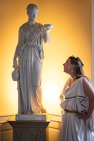 In the next group scene, we were then instructed to go to the dining hall. The multi-course dinners and lunches were catered and high quality. What made these dining scenes particularly epic were the statues and bas reliefs decorating the room that portrayed scenes from Greek mythology. The metatechnique that guided play in these scenes was dinner warfare, also featured in Wind’s larp Daemon (2021-). Unlike the intensely visible brutality in the Punishment ritual, we sat in circles masterminded by assigned seating to maximize drama. We pretended to be members of polite society while delivering passive aggressive verbal barbs, whether about art, the Muses’ confinement, class, or any number of other dynamics. (Gender, sexuality, and race/ethnic discrimination was explicitly forbidden in the larp, but class was very much embedded in the character design). This juxtaposition of high boiling intensity in the beginning directly to a low simmer punctuated the themes of the larp quite sharply: the epic alongside the banal, the fragility of human egos, the need to control in order to feel important, the subtle bids for freedom within enforced servitude, etc. According to the designers, traditions such as arranged seating were diegetically upheld as necessary, both due to affiliation to the Inspired’s prestigious university and the necessity to keep the ritual intact. Wind told me,