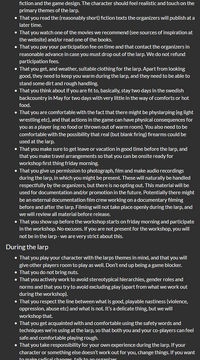 In the Nordic larp tradition, a Participation Contract is a non-legal contract that attempts to outline and formalize the responsibilities and promises between a larps organizers and the players. It can contain information on, for instance, play style, player safety issues, content, conduct, specific techniques etc., in order to make sure that players really understand what kind of game they've agreed to play.