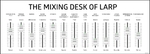 The Mixing Desk of Larp is a framework for organizing your thoughts about larp design. Look at it as a pedagogical tool more than a theory of larp design – it is an aid in visualizing the most important design choices a larpwright makes.